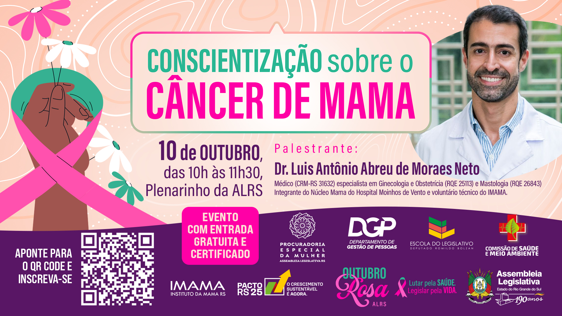 Realização e Apoio: Departamento de Gestão de Pessoas; Procuradoria Especial da Mulher; Escola do Legislativo; Comissão de Saúde e Meio Ambiente e IMAMA (Instituto da Mama do RS).